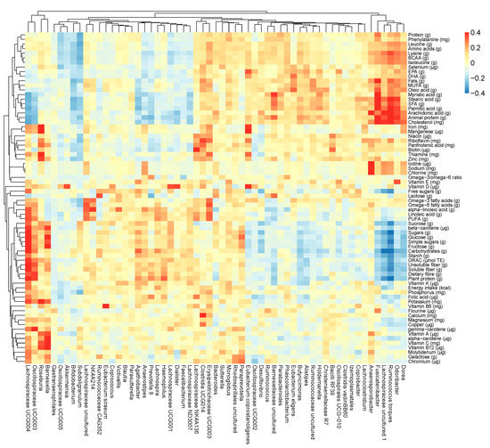 Heatmap of Spearman’s correlation coefficient between dietary intake (on the right side) and gut microbial genera (at the bottom).