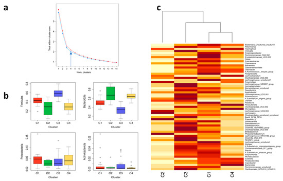 Elbow, box plot, and heatmap of gut microbiota composition in subjects (n = 89). (a) Total within-cluster sum of squares versus number of clusters computed by k-means clustering (red color for the family level and blue color for the genus level). (b) The relative abundance of the most abundant gut microbial phyla (Firmicutes, Bacteriodota, Proteobacteria, and Actinobacteria) in four clusters (C1, C2, C3, C4). (c) A heatmap of the relative abundance of different genera in the gut microbial community in four clusters (C1, C2, C3, C4).