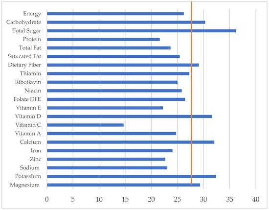 Figure 2a,b present the contribution of breakfast and the rest of the food eaten in a day to the daily recommended intake for Malaysian breakfast eaters. Energy intake at breakfast accounted for 27% of the daily recommended intake. Relative to the commonly used target of 20% for nutrient intakes at breakfast, the present study showed that breakfast made higher contributions to the daily total sugar (~38%), proteins (~28%), fat (~31%), saturated fat (~37%), sodium (~36%), thiamine (~25%), riboflavin (~23%), niacin (~35%) and zinc (~31%) intake levels. It provided lower contributions for fiber (~11%), iron (~18%), potassium (~15%), calcium (~12%), magnesium (~18%), vitamins C (~10%), D (~4%) and E (~2%) levels. On a daily basis, the intake of sugars, total fats, saturated fats, protein, and sodium exceeded the maximum recommended intakes, while the intake levels of all micronutrients (except niacin) were significantly below the daily recommendation.