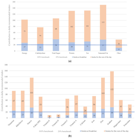 (a) Contribution of macronutrients within breakfast and rest of the day to daily recommended intakes for Malaysian breakfast eaters (n = 1428). (b) Contribution of micronutrients within breakfast and rest of the day compared to the daily recommended intake for Malaysian breakfast eaters (n = 1428). Note: 20% benchmark = 20% of the recommended intake of each nutrient (based on the RNIs), 100% benchmark = total recommendation per day (based on the RNIs).