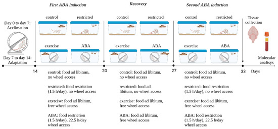 The ABA protocol used in this study was designed as previously described [27,28] (Figure 1). The acclimatization period lasted 1 week, then the animals were divided into 4 groups by randomizing body weight and were individually placed in standard home cages (sedentary rats) or home cages equipped with a running wheel (running rats): (1) ‘control’ rats had 24 h chow access but no access to the activity wheel; (2) ‘restricted’ rats were allowed chow access for 1.5 h/day but had no access to the activity wheel; (3) ‘exercise’ rats had both 24 h chow and activity-wheel access; and (4) ‘ABA’ rats were allowed chow for 1.5 h/day and had 22.5 h activity-wheel access. Rats were adapted to the housing conditions for 7 consecutive days with ad libitum food and running-wheel access (where applicable) (adaptation period). Body weight, food intake, and running-wheel activity (RWA) were recorded every day within 30 min of the start of the 12 h dark cycle to get an established baseline (BL).