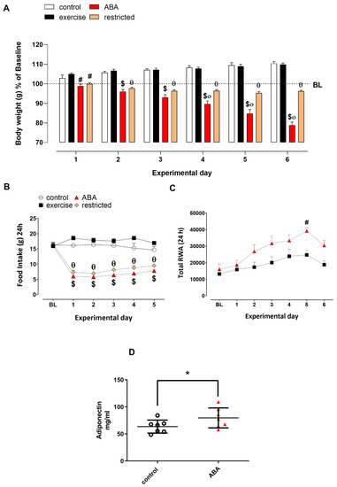 Body weight (A), food intake (B), and RWA (C) in control, exercise, restricted, and ABA groups during the 6 days of the first ABA induction. Results are presented as the mean ± SEM (n = 7 rats per group). Statistical analysis were performed by two-way ANOVA for repeated measures with two factors being groups as a between-subjects factor and time (days) as within-subjects factor and a repeated factor followed by Bonferroni post hoc test (Body weight: # p < 0.05 vs. exercise rats, $ p < 0.05 and θ p < 0.05 vs. control and exercise groups, ο p < 0.05 vs. restricted; food intake: $ p < 0.05 vs. control and exercise, θ p < 0.05 vs. control and exercise, ο p < 0.05 vs. restricted; RWA: # p < 0.05 vs. exercise). (D) Adiponectin levels were significantly increased in the blood of the ABA groups with respect to the control rats * p < 0.05, analysis was performed by the Student’s test.