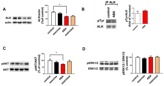 Our data also showed that the combination of diet restriction with physical exercise was conducive to marked alterations not only in ALK receptor expression but also in the levels of downstream receptor signaling. In general, ALK is a member of the insulin receptor superfamily, and activates different signaling pathways, such as the PI3K-AKT, JAK-STAT, and MAPK pathways. A large body of genetic and pharmacological evidence indicates that the PI3K/Akt signaling pathway is critical for cell growth and survival [45]. The downregulation of Akt signaling in the ABA group was likely due to a decreased expression of ALK receptor and data that go in the same direction as those obtained with ALK.