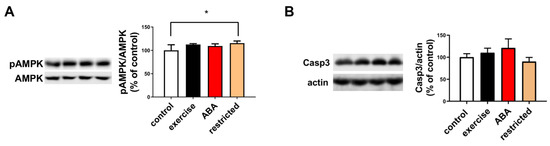 It is known that AMPK is a serine/threonine protein kinase, a key cellular sensor to regulate the homeostasis of energy. When AMPK is activated and phosphorylated, cell energy decreases to ensure the normal functions of physiological cell activities [39]. AMPK is a mediator of adaptive responses in the hypothalamus, regulating feeding behavior with modifications of nutrients and hormones. As presented in Figure 4A, only the restricted rats demonstrated an enhanced level of AMPK phosphorylation, while exercise and ABA rats did not show a significant increase [one-way ANOVA p < 0.05]. This finding would fit well with the catabolic state that occurs during starvation, where the energy to build new cells would be scarce. Moreover, exercise and the ABA group share free access to a running wheel that could affect the production of substances that could offset the energy expenditure brought on by exercise.