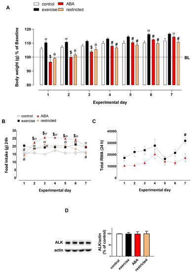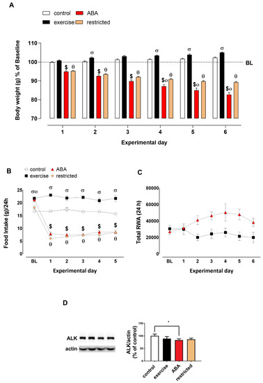Body weight, food intake, and RWA, in control, exercise, restricted, and ABA groups during the second ABA induction (A–C). Results are presented as the mean ± SEM (n = 7 rats per group). Data were analyzed using two-way ANOVA followed by Bonferroni post hoc test for repeated measures (body weight: # p < 0.05 vs. exercise rats, $ p < 0.05 and θ p < 0.05 vs. control and exercise groups, ο p < 0.05 vs. restricted, σ p < 0.05 vs. control; food intake: σ p < 0.05 vs. control, $ p < 0.05 vs. control and exercise, θ p < 0.05 vs. control and exercise, ο p < 0.05 vs. restricted). (D) Protein level of ALK in the hypothalamus (n = 6 rats), * p < 0.05 versus control, by ANOVA followed by Tukey’s test (n = 6 rats).