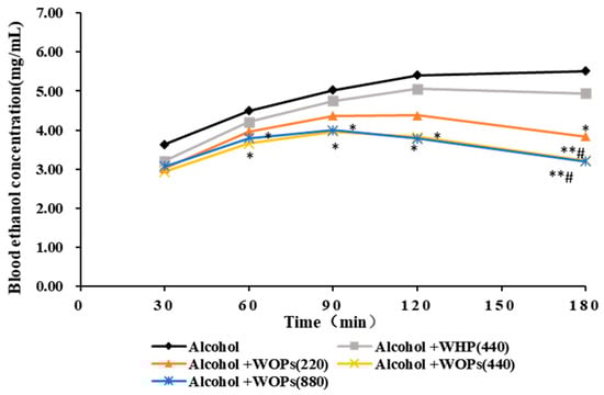 3.3. Effect of WOPs on Blood Ethanol Concentration of Mice