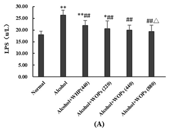 The contents of serum total proteins (TP), albumin (ALB), globulin (GLB), and the ratio of albumin to globulin (A:G) in the alcohol control group were remarkably lower than those in the normal control group (p < 0.05 for ALB, p < 0.01 for TP, GLB, and A: G). The TP, ALB, GLB, and A:G levels were increased in three WOPs intervention groups, in which TP, GLB, and A:G values in the medium- and high-dose WOPs groups were dramatically different from those in the alcohol control group (p < 0.01).