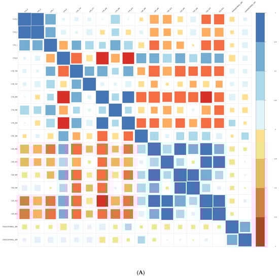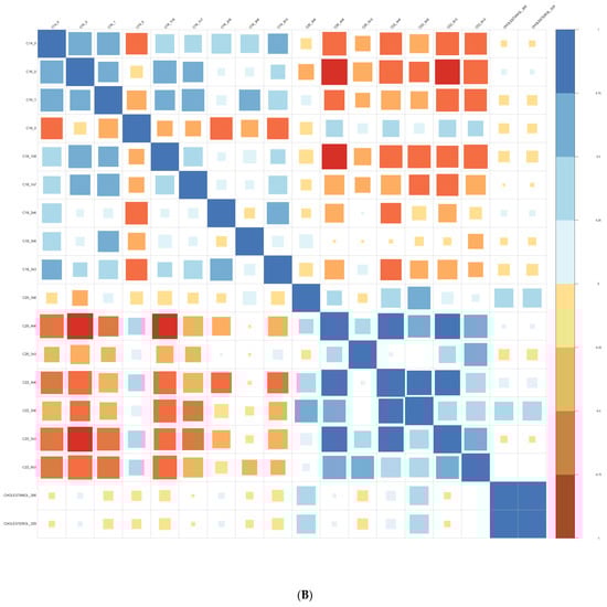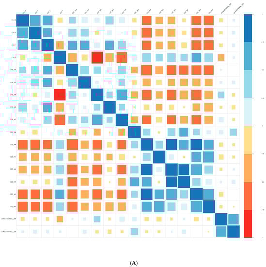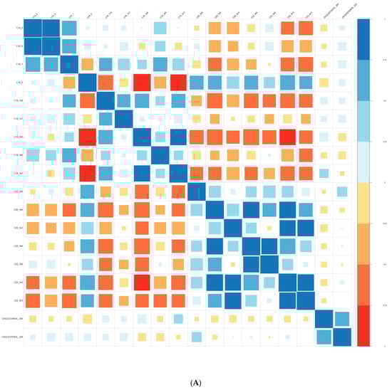 Correlation matrix of fatty acids and sterols at baseline in converters (A) and non-converters (B). White: no significant correlation (p > 0.05). Blue: positive correlations. Yellow/orange/red: negative correlation. The intensity of the colour and the size of the squares are proportional to the correlation coefficients. There was no correction for multiple comparisons.