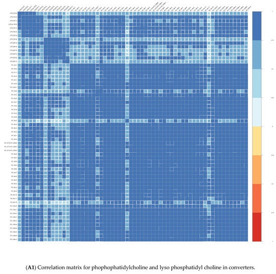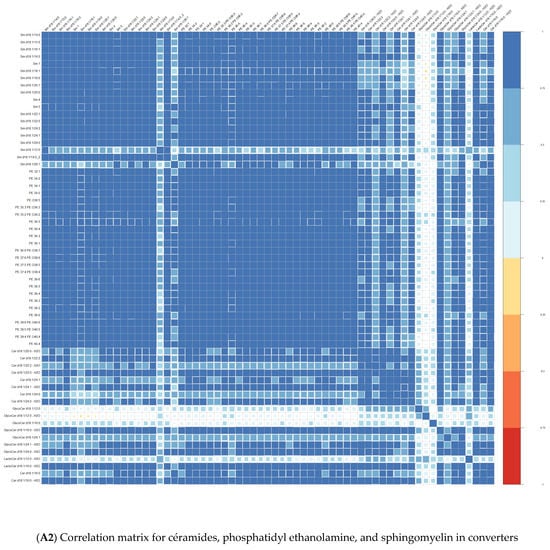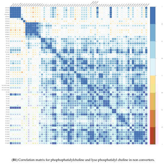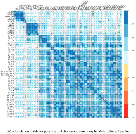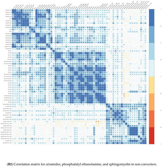There are differences between the fatty acid correlation patterns (matrix correlations using the Spearman method) at inclusion and the final time (Figure 7), particularly in the converters (Figure 8) and also for phospholipids (Figure 9).