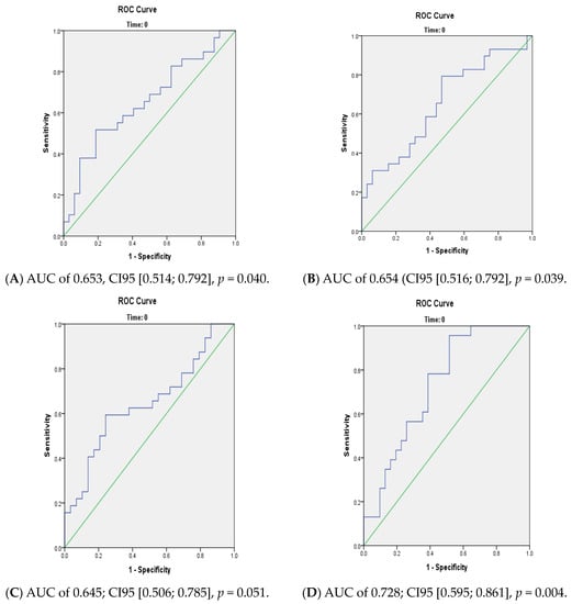 We conducted a logistic regression after a reduction in dimensions using a principal component analysis to predict the psychotic conversion using measures at inclusions. Using the linoleic acid (LA) level alone produced a similar result (AUC of 0.654 (CI95 [0.516; 0.792], Figure 4B) to using all FA levels (AUC of 0.653, CI95 [0.514; 0.792], Figure 4A) or using all the phospholipid levels (PL, AUC of 0.645; CI95 [0.506; 0.785], Figure 4C). The best prediction was obtained by combining LA, phosphatidylcholine species, and the cholestanol/cholesterol ratio (AUC of 0.728 (CI95 [0.595; 0.861]), Figure 4D).