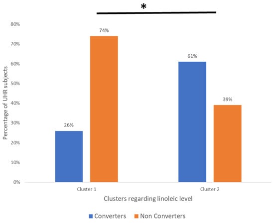 Clustering was carried out using the level of linoleic acid (LA, omega-6), distinguishing two subgroups of patients (clustering): those with a low LA level have a risk for psychosis lower than that of subjects with a high LA level (26.1% vs. 60.5%, p = 0.02) (Figure 5 and Table 3). The two subgroups exhibit other significantly different membrane PUFA levels (higher levels of arachidonic acid (C20:4n6), docosatetraenoic acid (C22:4n6), and docosapentaenoic acid (C22:5n-3) and lower levels of α-linolenic acid (C18:3n3) in the subgroup with the lowest risk of psychosis) (Table 4). There are also differences in fatty acid patterns (Figure 6). Heatmap is in Supplementary Figure S3.