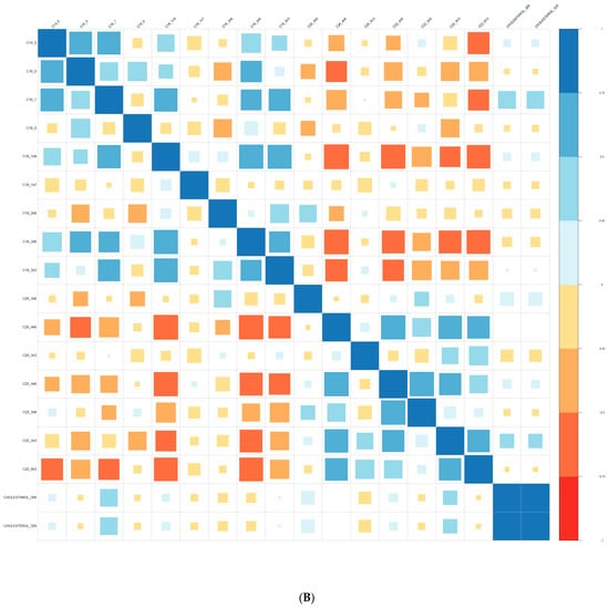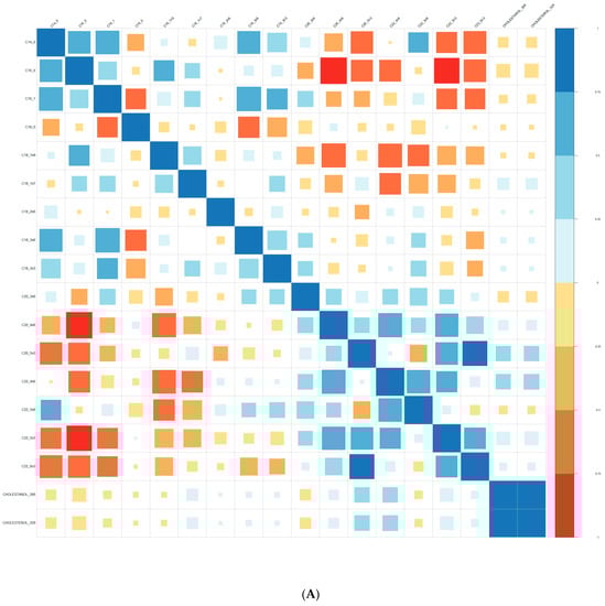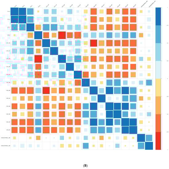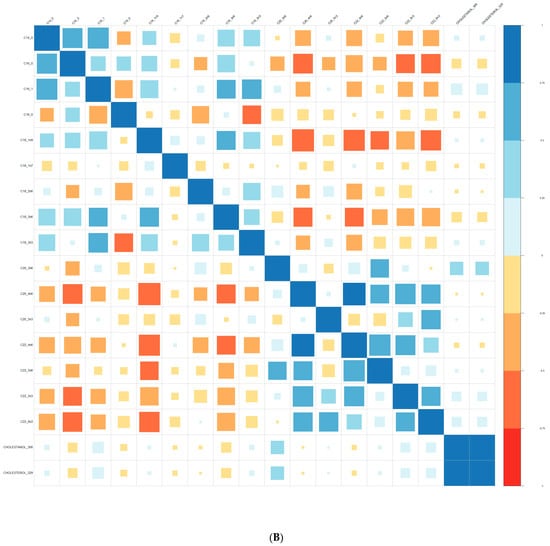 Correlation matrix of fatty acids and sterols in converters at baseline (A) and final time (B). White: no significant correlation (p > 0.05). Blue: positive correlations. Yellow/orange/red: negative correlation. The intensity of the colour and the size of the squares are proportional to the correlation coefficients. There was no correction for multiple comparisons.