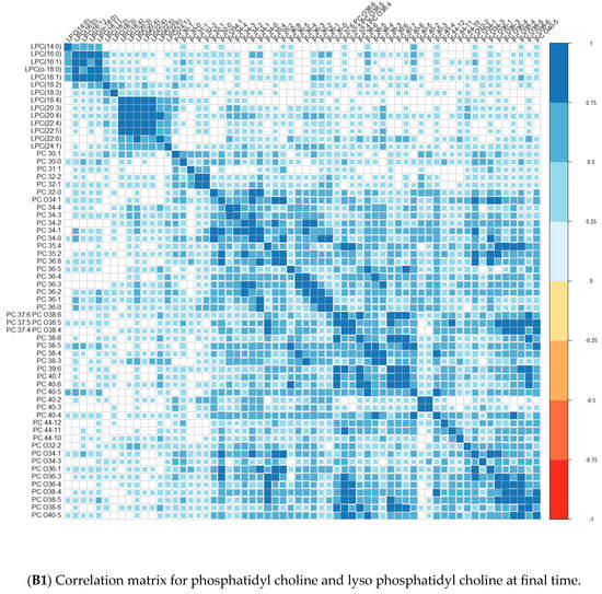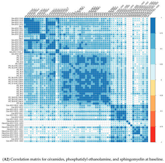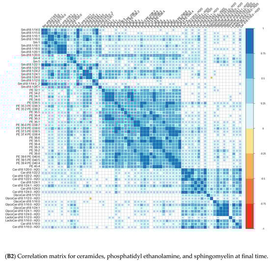 Correlation matrix of phospholipids at baseline (A1,A2) and final time (B1,B2). White: no significant correlation. Blue: positive correlations. Yellow/orange/red: negative correlation. The intensity of the colour and the size of the squares are proportional to the correlation coefficients. There was no correction for multiple comparisons. Cer: Céramides; Glyco Cer: Glyco Céramides; Lacto Cer: Lacto Céramides; LPC: Lyso Phosphatidyl Choline; PC: Phosphatidyl Choline; PE: Phosphatidyl Ethanolamine; SM: Sphingomyelin.