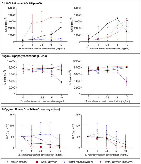 Dose–response relationships between mushroom extract concentration and inflammatory mediator release following stimulation. Peripheral blood mononuclear cells (PBMCs) were isolated from whole blood collected from healthy volunteers (n = 3–5) and seeded at a density of 2 × 106 cells/mL. Cells were treated with 1, 2.5, 5, and 10 mg/mL Hericium (H.) coralloides and Trametes (T.) versicolor extracts (water–ethanol without Kakadu Plum (KP), water–ethanol with KP; water–glycerin, water–glycerin liposomal) for 3 h, and then stimulated with 0.1 MOI influenza A/H1N1pdm09 (top panel, n = 5), 5 ng/mL lipopolysaccharide (E. coli) (center panel, n = 5), or 100 µg/mL house dust mite (D. pteronyssinus) (bottom panel, n = 3) for a total of 48 h at 35 °C, 5% CO2. The concentration of interleukin (IL)-6 (top and center panel) and IL-5 (bottom panel) were measured via DuoSet ELISA. Data are displayed as mean ± standard deviation.