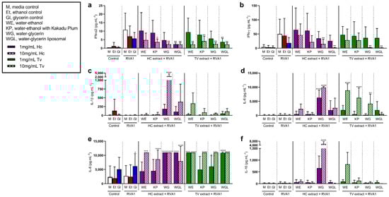 Effects of Hericium coralloides and Trametes versicolor extracts on immune cell responses to rhinovirus A1 (RVA1) stimulation. Peripheral blood mononuclear cells (PBMCs) were isolated from whole blood (n = 8) and seeded at a density of 2 × 106 cells/mL. Cells were treated with 1 (solid color) or 10 mg/mL (check pattern) mushroom extracts (HC, Hericium coralloides; TV, Trametes versicolor) for 3 h, and then stimulated with 1 MOI RVA1 for a total of 48 h at 35 °C, 5% CO2. The concentration of (a) interferon (IFN)-α2, (b) IFN-γ, (c) interleukin (IL)-1β, (d) IL-6, (e) IL-8, and (f) IL-10 were measured via the LEGENDplexTM assay. Data are displayed as mean with standard deviation, analyzed using one-way ANOVA with Holm–Sidak multiple comparisons where appropriate. * p < 0.05, ** p < 0.01, *** p < 0.001, **** p < 0.0001, compared to RVA1 media control. M, media control; E, ethanol control; G, glycerin control; WE, water–ethanol; KP, water–ethanol with Kakadu Plum; WG, water–glycerin; WGL, water–glycerin liposomal.