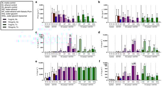 Effects of Hericium coralloides and Trametes versicolor extracts on immune cell responses to influenza A/H1N1pdm09 (H1N1) stimulation. Peripheral blood mononuclear cells (PBMCs) were isolated from whole blood (n = 8) and seeded at a density of 2 × 106 cells/mL. Cells were treated with 1 (solid color) or 10 mg/mL (check pattern) mushroom extracts (HC, Hericium coralloides; TV, Trametes versicolor) for 3 h, and then stimulated with 0.1 MOI H1N1 for a total of 48 h at 35 °C, 5% CO2. The concentration of (a) interferon (IFN)-α2, (b) IFN-γ, (c) interleukin (IL)-1β, (d) IL-6, (e) IL-8, and (f) IL-10 were measured via the LEGENDplexTM assay. Data are displayed as mean with standard deviation, analyzed using one-way ANOVA with Holm–Sidak multiple comparisons where appropriate. * p < 0.05, ** p < 0.01, *** p < 0.001, **** p < 0.0001, compared to H1N1 media control. M, media control; Et, ethanol control; Gl, glycerin control; WE, water–ethanol; KP, water–ethanol with Kakadu Plum; WG, water–glycerin; WGL, water–glycerin liposomal.
