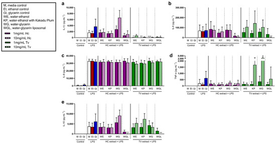Effects of Hericium coralloides and Trametes versicolor extracts on immune cell responses to lipopolysaccharide (LPS) stimulation. Peripheral blood mononuclear cells (PBMCs) were isolated from whole blood (n = 8) and seeded at a density of 2 × 106 cells/mL. Cells were treated with 1 (solid color) or 10 mg/mL (check pattern) mushroom extracts (HC, Hericium coralloides; TV, Trametes versicolor) for 3 h, and then stimulated with 5 ng/mL LPS (E. coli) for a total of 48 h at 35 °C, 5% CO2. The concentration of (a) interleukin (IL)-1β, (b) IL-6, (c) IL-8, (d) tumor necrosis factor (TNF)-α, and (e) IL-10 were measured via the LEGENDplexTM assay. Data are displayed as mean with standard deviation, analyzed using one-way ANOVA with Holm–Sidak multiple comparisons where appropriate. * p < 0.05, ** p < 0.01, *** p < 0.001, compared to LPS media control. M, media control; E, ethanol control; G, glycerin control; WE, water–ethanol; KP, water–ethanol with Kakadu Plum; WG, water–glycerin; WGL, water–glycerin liposomal.