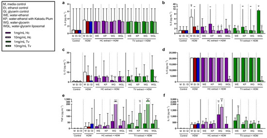 Effects of Hericium coralloides and Trametes versicolor extracts on immune cell responses to house dust mite (HDM) stimulation. Peripheral blood mononuclear cells (PBMCs) were isolated from whole blood (n = 8) and seeded at a density of 2 × 106 cells/mL. Cells were treated with 1 (solid color) or 10 mg/mL (check pattern) mushroom extracts (HC, Hericium coralloides; TV, Trametes versicolor) for 3 h, and then stimulated with 100 μg/mL HDM (D. pteronyssinus) for a total of 48 h at 35 °C, 5% CO2. The concentrations of (a) interleukin (IL)-4, (b) IL-5, (c) IL-13, (d) IL-6, (e) tumor necrosis factor (TNF)-α, and (f) IL-10 were measured via the LEGENDplexTM assay. Data are displayed as medians with an interquartile range, analyzed using the Friedman Test with Dunn’s multiple comparisons where appropriate. * p < 0.05, ** p < 0.01, *** p < 0.001, **** p < 0.0001, compared to HDM media control. M, media control; E, ethanol control; G, glycerin control; WE, water–ethanol; KP, water–ethanol with Kakadu Plum; WG, water–glycerin; WGL, water–glycerin liposomal.