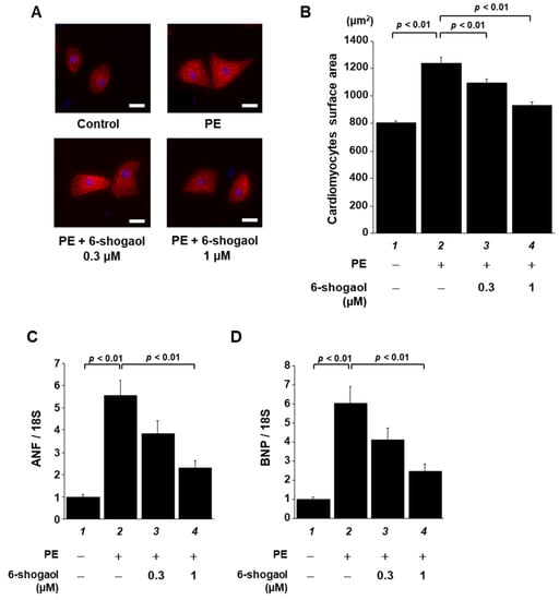 3.1. 6-Shogaol Significantly Suppressed PE-Induced Hypertrophic Responses in Cardiomyocytes