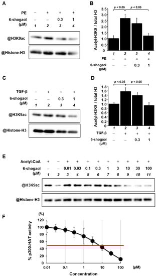 3.3. 6-Shogaol Blocked PE- and TGF-β-Induced Acetylation of Histone H3K9 through the Inhibition of p300-HAT Activity