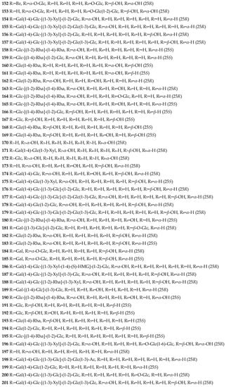 Steroidal saponins of Allium can be classified into three major categories according to the existence of E and F rings: furostane (F ring cleavage), spirostane (E/F rings into spiral rings), and cholestane (with C-17 side chains rather than oxygenated spiral rings) saponins, in addition to a few special glycoside types of steroidal saponins. The A/B ring of steroidal saponins is cis or trans (5-β and 5-α), the B/C ring is trans, the C/D ring is trans, and the D/E ring is cis. The C-10 and C-13 positions are connected to β-CH3, the C-20 is connected to α-CH3, and the C-25 position has two configurations of R and S. Steroidal saponins are commonly attached to straight chain sugar chains or branched sugar chains at C-3, and the types of saccharides are commonly glucose, galactose, rhamnose, xylose, and arabinose. The number of saccharides attached to steroidal saponins from Allium varies from one to five. All steroidal saponins isolated from Allium reported in the literature are shown in Table 1.