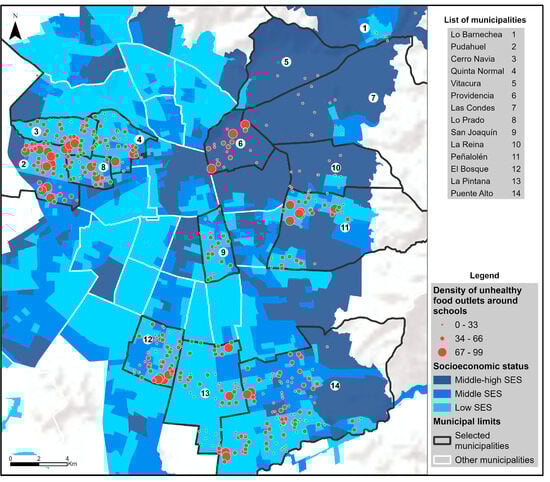 Based on this background information and the high childhood obesity rates observed among Chilean children, we considered it important to characterize the food environment in neighborhoods with different socioeconomic characteristics. Thus, the aim of this study was to compare density and proximity of unhealthy foods outlets around public schools located in socioeconomically diverse neighborhoods in the city of Santiago, Chile.