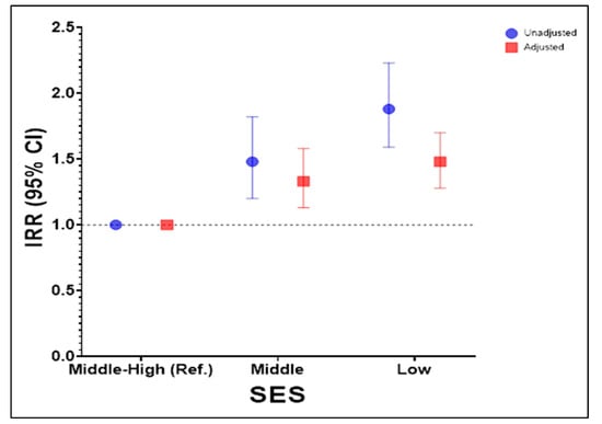 To examine in greater detail the association between SES and unhealthy food outlets, we estimated a negative binomial regression model (Figure 2), with middle-high SES as the reference. This model is shown adjusted and unadjusted by population density. On average, schools located in the most vulnerable areas present an 88% higher relative risk of having unhealthy food stores, compared to middle-high SES areas (IRR = 1.88; 95% CI 1.59–2.23). Similarly, observing the socioeconomic gradient between schools, those located in areas with a population classified as middle SES have a 48% higher relative risk of higher counts compared to those with a middle-high SES (IRR = 1.48; 95% CI 1.20–1.82).