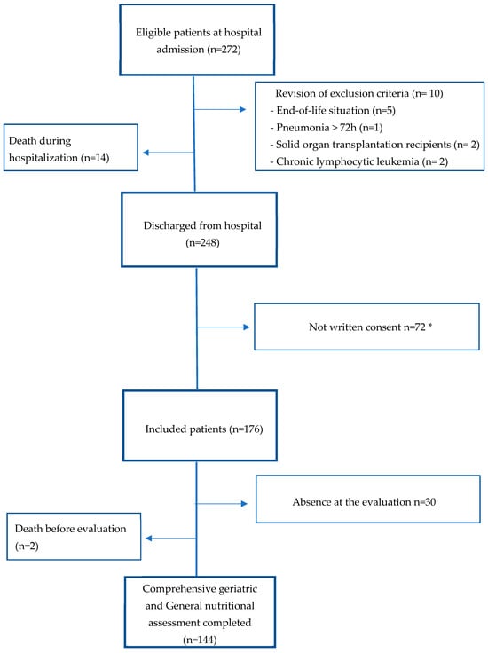 Two hundred and seventy-two patients were eligible for inclusion at hospital admission. Fourteen patients were excluded due to death during hospitalization, and ten were excluded when we revised the exclusion criteria a second time. Two hundred and forty-eight participants were invited to participate, but only one hundred and seventy-six patients accepted. Two patients died before evaluation, and thirty patients did not attend the evaluation. Most withdrawals from this study were due to lockdown in the context of the SARS-CoV-2 pandemic. A total of 144 patients completed the evaluation (see Figure 1).