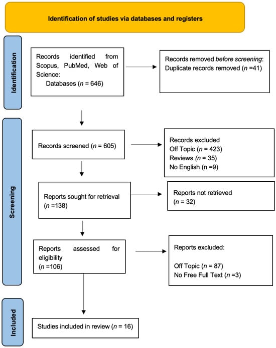 Keyword searches of the Web of Science (95), Scopus (0), and Pubmed (551) databases yielded a total of 646 articles. After that, 41 duplicates were removed, and 605 articles were included. A total of 574 of these 590 research studies were disqualified for violating the inclusion criteria that had been previously established. Following the screening process, 16 publications were chosen for this work (Figure 3). Each study’s findings are listed in Table 2.