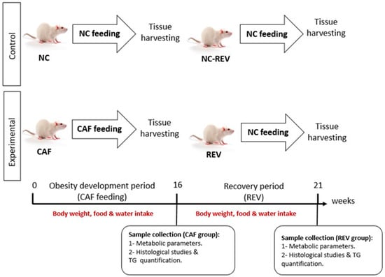 All experimental procedures were approved by the Institutional Animal Care and Use Committee at Qatar University (QU-IACUC# 019/2014) and performed at Qatar University Laboratory Animal Research Center (LARC), in accordance with the guidelines and regulations of the Guide for the care and use of Laboratory Animals published by the US National Institutes of Health. Seventy-nine male Sprague Dawley rats (Charles River, UK) were housed under controlled environmental conditions: temperature (20–23 °C ± 1 °C), humidity (30–70% ± 5%), and light/dark cycle (12:12). At 8–9 weeks of age, rats were weighed and randomly assigned to 3 animal cages for the following main groups: the NC diet group (control, n = 26), the cafeteria diet group (CAF, n = 26) and the reversible group (REV, n = 27), in whom the CAF diet was reverted to NC for 3 weeks after 18 weeks of CAF feeding. The NC group had ad libitum access to the NC diet (carbohydrate 49%, fat 4.6%, protein 14.4%), and regular water for 16–18 weeks. After this period, the NC group was further divided into another control group called NC-REV and used as a control for the REV group (Figure 1). The CAF group had ad libitum access to both the NC and CAF (carbohydrate 60–70%, fat 10%, protein 9–12%) diets, and water with 5% added sugar (sucrose) to represent soda drinks for the same time period (the total carbohydrate content represented the food and the sugary water). The CAF diet was provided freshly every day. Animals in the CAF group could select and consume freely either of the NC and CAF diets, which were provided in excess (see Supplementary Material: S1; Table S1). The REV group was treated the same as the CAF group but was switched at week 18 to NC and regular water for 3 weeks (weeks 19–21). Food and water intake as well as body weight were measured and recorded weekly throughout this study.