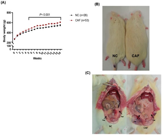 Over a period of 16–18 weeks, CAF-fed rats gained significantly more weight compared to NC-fed rats (p < 0.001; Figure 2A). NC rats gained 290 g on average over 16 weeks, while CAF rats gained 350 g on average during the identical period. There is no threshold that has been established to diagnose obesity in animal models, such as those established for human. Thus, in this study, an animal that gained 20–30% weight compared to control was considered an obese animal, as described previously []. Comparing the appearance of NC- and CAF-fed rats, NC-fed rats were visibly leaner than CAF-fed rats (Figure 2B) and CAF-fed rats showed increased adipose tissue deposition in the abdominal area compared to NC-fed rats (Figure 2C).