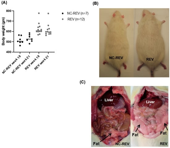 Effect of diet switch on body weight. (A) REV rats lost 6% of their initial weight when their diet was switched to NC. NC rats continue to gain weight as part of their physiological growth. None of the changes in either the NC or REV group were statistically significant. Data were analyzed by one-way ANOVA and expressed as the mean ± SEM. (B) External body size of representative animals from the NC and CAF groups; REV rat still appeared bigger compared to the NC fed-rat. (C) REV rats showed abdominal fat deposition, apparent in the abdominal cavity compared to the NC-fed rats. Black arrows are pointing at the fat tissues in the abdominal cavity.