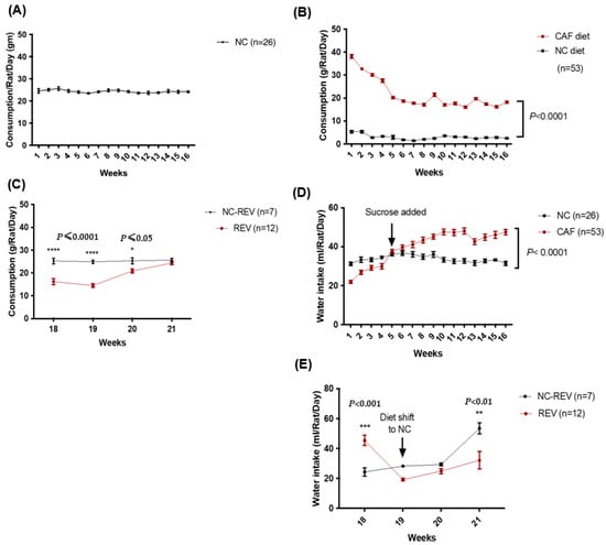 NC-fed rats showed constant water intake throughout the 16–18-week study period (Figure 4D). Initially, CAF-fed rats consumed less water compared to NC-fed rats, although addition of sucrose to the drinking water at week 5 significantly increased intake among CAF-fed rats (p < 0.001) (Figure 4D). The caloric intake for each group was estimated to be 70.1 kcal/rat/day for the NC group and ranging between 87 and 98 kcal/rat/day for the CAF group (including the sucrose in water).In the first week of the reversibility period, REV rats showed a drop in water intake, which increased towards the end of the 3 weeks. Water intake was stable in the NC-REV rats throughout the study period, until week 21, when an increase in intake was observed (Figure 4E).