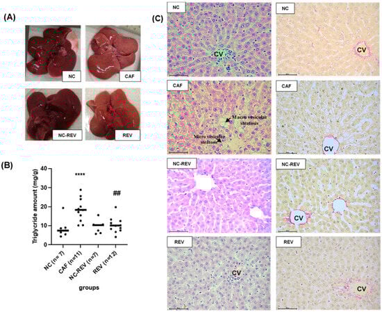Hepatic fat accumulation was evaluated by measuring tissue TG content. The TG content of the CAF-fed livers was significantly higher (p ≤ 0.01) compared to those of the NC-fed animals and significantly decreased (p ≤ 0.001) in the REV group (Figure 5B).