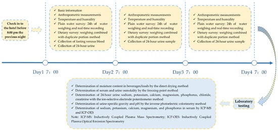 Under conditions close to daily life, pregnant women undertook a 3-day metabolic trial in a hotel similar to a metabolic ward. Their height, weight, body composition, physical activity, as well as the temperature and humidity of the environment, were all well measured and recorded. We provided participants with sufficient bottled water of the same type (550 mL/bottle, Nongfu Spring, Hangzhou, China) and kept diligent records of the time and amount consumed each time. Meals and snacks were provided buffet-style, with detailed intake records for all foods and beverages using weighing combined with duplicate portion method. Over three days, fasting venous blood and 24 h urine samples from pregnant women were collected for the determination of hydration biomarkers, including serum/urine osmolality, urine pH and urine specific gravity (USG), as well as the levels of major electrolytes in serum/urine (see Figure 1 for more details). As shown in Supplementary Figure S1, strict quality control was implemented at every stage of this study.