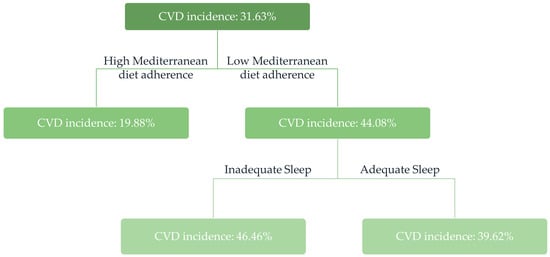 For a more straightforward and clinically relevant depiction, Figure 2 presents the classification tree concerning CVD incidence in relation to MD adherence, sleep habits, and age and sex; no differences by age and sex were observed.