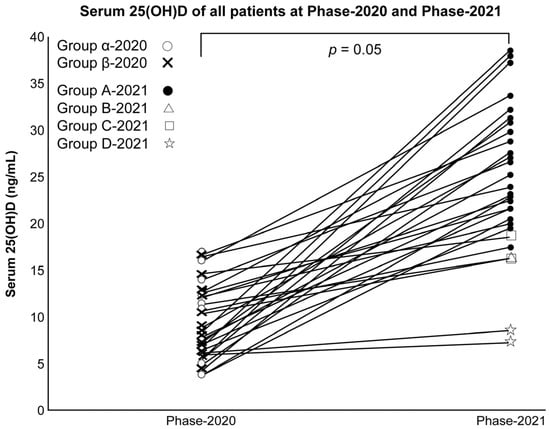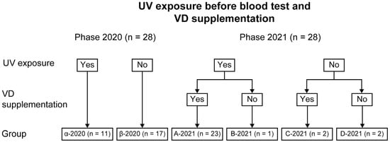 In Phase 2020, the subjects were allocated to the following groups according to the opportunities for UV exposure before the blood test: Phase 2020 with (Group α-2020 [n = 11]) and without UV exposure (Group β-2020 [n = 17]). In Phase 2021, the subjects were allocated to the following groups: Group A-2021 with UV exposure before the blood test and VD supplementation (n = 23), Group B-2021 with UV exposure and no VD supplementation (n = 1), Group C-2021 with VD supplementation and no UV exposure (n = 2), and Group D-2021 without UV exposure and VD supplementation (n = 2). Based on the Phase 2020 blood test results, the number of subjects with UV exposure before the blood test increased from Phase 2020 to Phase 2021. This is because our institution has been working to increase UV exposure opportunities in our subjects whenever possible [].