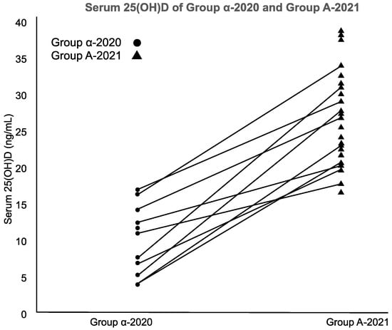 Group α-2020 (n = 11) and Group A-2021 (n = 23) had opportunities for UV exposure but varying VD supplementation. Their serum 25(OH)D and VD intake/RDA ratio increased significantly (both p < 0.001; Mann–Whitney’s U-test) (Figure 3).