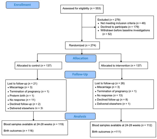 We used a modified intention-to-treat approach, including all randomly assigned participants with available outcome data. We excluded participants withdrawn before the 24–28 weeks gestation follow-up. For primary outcomes, mean differences and corresponding 95% confidence intervals (CIs) between groups were estimated and adjusted for baseline values and intervention duration through the analysis of covariance test. For secondary outcomes, we compared group differences using the independent t-test or Pearson’s chi-squared test, as appropriate. We performed additional analyses by stratifying participants into overweight and obese categories, restricting the analysis to participants with persistent 25OHD insufficiency, or those with at least 80% compliance [36,37]. We used a two-sided significance level of 5% for pre-specified primary and secondary outcomes without adjustment for multiple comparisons. We conducted statistical analysis using SPSS statistical software (version 20; IBM Corp., Armonk, NY, USA).