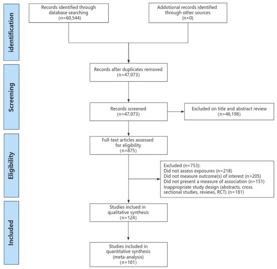 Overall, 60,544 articles were found by searching the PubMed, EMBASE, and Cochrane libraries. After eliminating duplicates and publications that did not meet the criteria for inclusion, 875 potential full-text articles relevant to this study were identified. Through full-text review, we excluded an additional 753 articles (Figure 1). Lastly, 124 cohort study reports were incorporated into the systematic review, and 101 were subsequently included in the meta-analysis. Among the studies related to mortality, 40 reported on the impact of protein intake, 46 reported on fat intake, and 19 reported on carbohydrate intake. Regarding CVD events, we identified 8 publications for protein, 44 for fat, and 9 for carbohydrates.