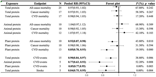 Seven publications with 15 cohorts examined the association between total protein intake and CVD events. These studies included 286,075 participants and 10,278 CVD events, including 4899 stroke events. A high intake of total protein was generally negatively correlated with the prevalence rates of CVD and stroke (highest versus lowest, CVD morbidity: 0.90 (0.84, 0.97), I2 = 38.8%, p = 0.006; stroke morbidity: 0.84 (0.75, 0.95), I2 = 0.0%, p = 0.004).