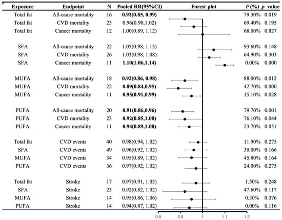 A summary plot for the association of fat intake with CVD morbidity and mortality. Analyses were conducted using generic, inverse variance random-effects models (at least five study comparisons available) or fixed-effects models (fewer than five study comparisons available). Abbreviations: CI, confidence interval; CVD, cardiovascular disease; RR, risk ratio; MUFA, monounsaturated fatty acid; PUFA, polyunsaturated fatty acids; SFA, saturated fatty acid. Statistically significant results will be annotated with bold values.