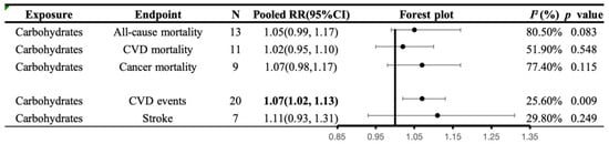 A summary plot for the association of carbohydrates intake with CVD morbidity and mortality. Analyses were conducted using generic, inverse variance random-effects models (at least five study comparisons available) or fixed-effects models (fewer than five study comparisons available). Abbreviations: CI, confidence interval; CVD, cardiovascular disease; RR, risk ratio. Statistically significant results will be annotated with bold values.