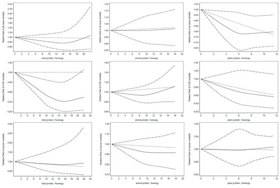 Non-linear dose-response association of intakes of total, animal, plant protein based on percentage of energy with risk of mortality in adults aged 19 or older. Analyses were conducted using random-effects model. Abbreviations: CVD, cardiovascular disease. Solid line represents non-linear dose response and dotted lines represent 95% confidence interval.