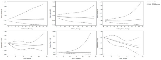 Non-linear dose-response association of intakes of total protein, total fat, carbohydrates, SFA, MUFA, and PUFA based on percentage of energy with risk of CVD in adults aged 19 or older. Analyses were conducted using a random-effects model. Abbreviations: CVD, cardiovascular disease; MUFA, monounsaturated fatty acid; PUFA, polyunsaturated fatty acids; SFA, saturated fatty acid. Solid line represents non-linear dose response and dotted lines represent 95% confidence interval.
