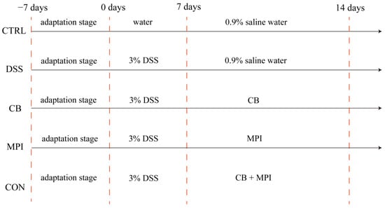 Animal experiments were performed on the basis of the Guidelines for Care and Use of Laboratory Animals of Hunan Agricultural University. Fifty ICP female mice (Slaughter Jingda Co., Changsha, China), 8 weeks old and weighing an average of 20 g, were placed in a room with a temperature of 24 ± 1 °C and a 12-h cycle of darkness and light. During the experiment period, the mice could drink water and feed at will. After 7 days of adaptation, the mice were randomly assigned to five groups (n = 10 per group): CTRL, DSS, CB, MPI, and CON (Figure 1). From days 0 to 7, mice in the CTRL group were given drinking water, whereas mice in the other groups were given drinking water supplemented with 3% (w/v) DSS (molecular weight 36,000–50,000 Da; Dalian Meilun Biotechnology Co., Ltd., Dalian, China) to induce UC. From days 8 to 14, mice in the CTRL group and DSS group were given 0.9% normal saline by intragastric gavage; the CB group was gavaged with CB 1 × 106 colony forming units (CFU); the MPI group was gavaged with MPI 300 mg/kg; and the CON group was gavaged with CB 5 × 105 CFU and MPI 150 mg/kg.