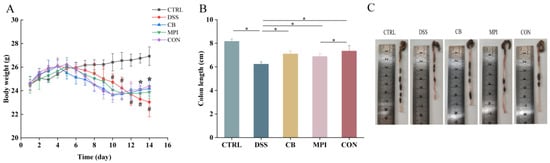 The effects of CB, MPI, and CON on body weight and colon length in mice. (A) Weight change in each group; (B) changes of colon length in each group; (C) colon chart in each group of mice. Compared with CTRL, # p < 0.05; compared with DSS, * p < 0.05.