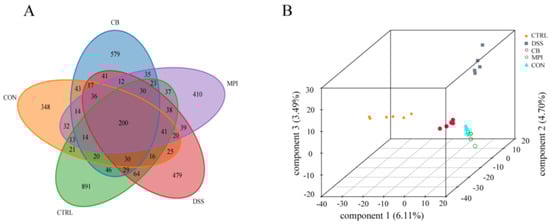 Effects of CB, MPI, and CON on β-diversity of intestinal microbes in mice. (A) Venn chart; (B) PLS-DA 3D chart.