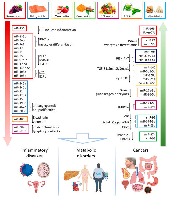 Diet-derived nutrients and miRNA expression. Bioactive compounds, such as curcumin, quercetin, vitamins, fatty acids, EGCG, resveratrol, and genistein, affect human miRNA expression and regulate several pathways, thus modulating the development of pathological chronic states, including inflammatory diseases, metabolic disorders, and cancer. The up arrows stand for upregulation, while the down ones indicate downregulation. AKT, protein kinase B; EGCG, epigallocatechin gallate; FOXO1, Forkhead Box O1; JMJD1A, Jumonji domain-containing 1A; LIN28A, Lin-28 Homolog A; LPS, lipopolysaccharide; miR, microRNA; PAK2, p21 activated kinase 2; MMP, matrix metalloproteinase; PGC1α, peroxisome proliferator-activated receptor gamma coactivator 1α; PI3K, phosphatidyl inositol 3-kinase; PTEN, phosphatase and tensin homolog; SMAD, small mother against decapentaplegic; TGF, transforming growth factor.
