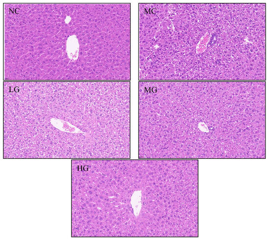 Effects of JFP-Ps on liver histopathological characteristics (original magnification 40×, bar 20 μm). NC: normal control group; MC: model control group; LG: JFP-Ps low-dose group at 50 mg JFP-Ps/kg body weight; MG: JFP-Ps medium-dose group at 100 mg JFP-Ps/kg body weight; HG: JFP-Ps high-dose group at 200 mg JFP-Ps/kg body weight.
